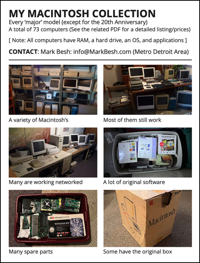 I have a collection of every ‘major’ Macintosh model ever made (except for the 20th Anniversary). There are a total of 73 computers (all of which have memory, a hard drive, an OS, and a variety of applications). MOST of them work and a dozen of them are networked together in my basement (in the Detroit Metro area).
