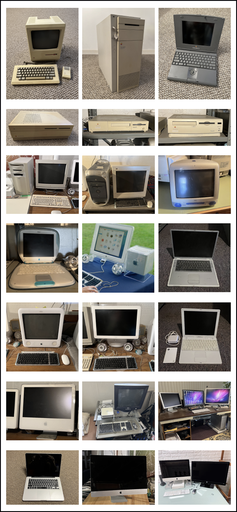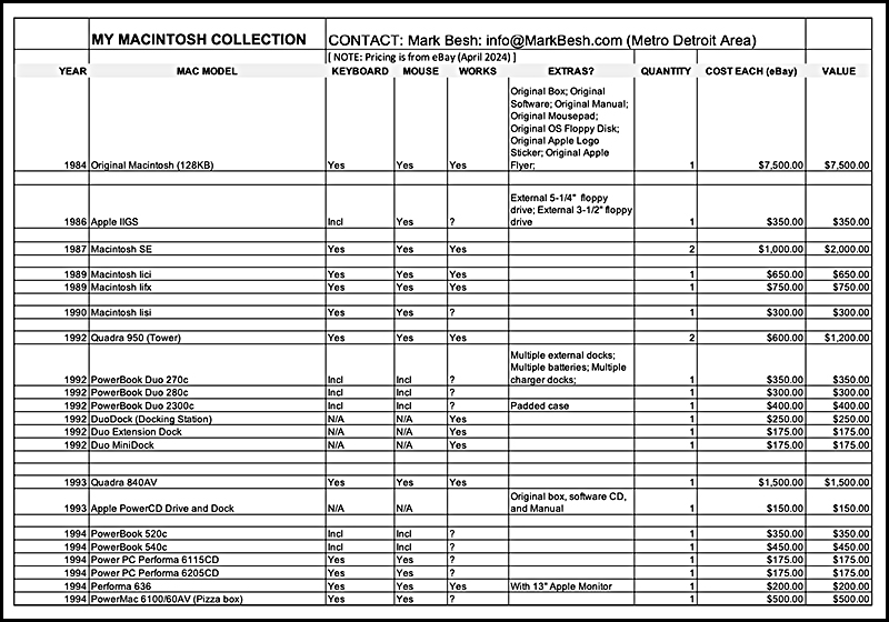 There are two PDFs below—that you can download—that have all the details. One is a listing of all of the computers, what comes with them, and a whole bunch of miscellaneous items. The pricing associated with each item came from eBay in April 2024. The other PDF has a photo of each Mac, some details about it, all the items that come with it, and photos of most of the miscellaneous items.